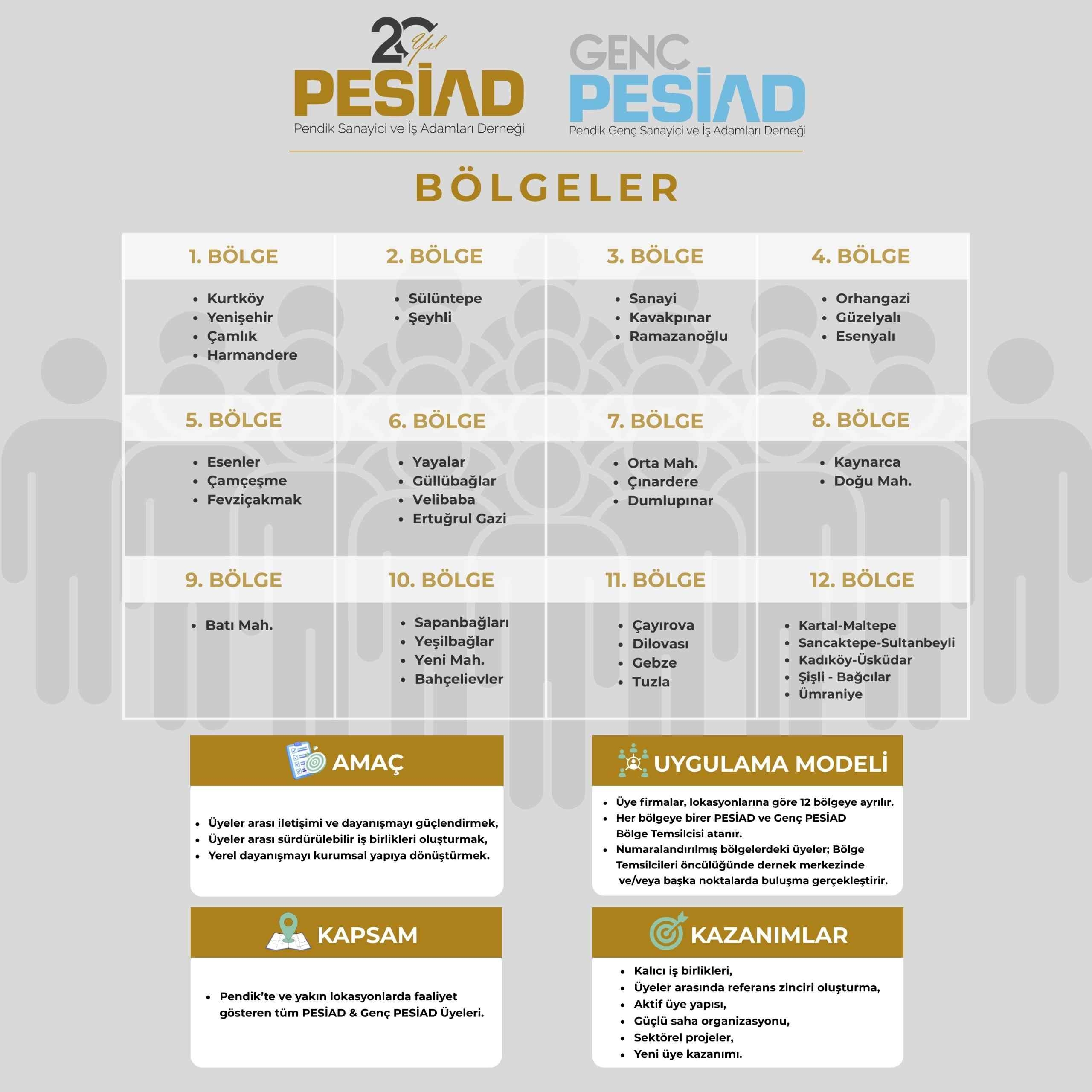 PESİAD üyeleri arasındaki iletişimi ve dayanışmayı güçlendirmek, karşılıklı tanışıklığı artırmak ve sürdürülebilir iş birlikleri oluşturmak amacıyla; Teşkilatlanma Birimimiz bünyesinde Bölge Buluşmaları Projesi hayata geçirilmektedir.