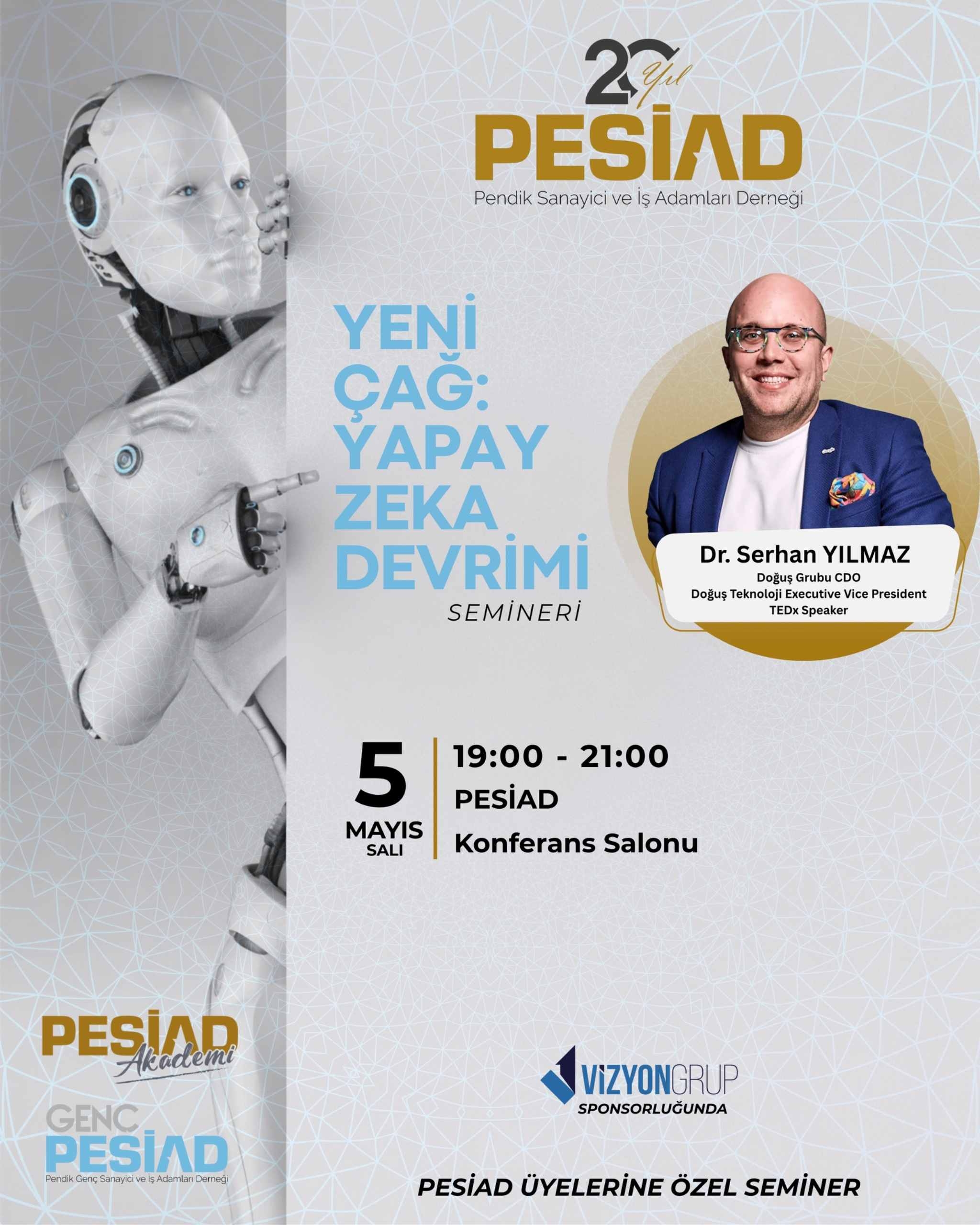 PESİAD Akademi bünyesinde, 1Vizyon Grup Sponsorluğu'nda; Dr. Serhan YILMAZ'ın sunumlarıyla “Yeni Çağ: Yapay Zekâ Devrimi” başlıklı seminer düzenlenecektir. Seminerimizde; teknolojinin iş modellerine etkisi, dönüşüm stratejileri ve rekabet avantajı yaratmanın yeni yolları ele alınacaktır.